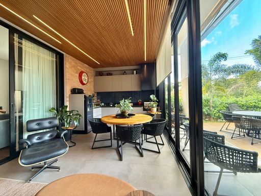 ▫️ Sala de jantar e sala de estar/TV integradas à área gourmet, com ar-condicionado