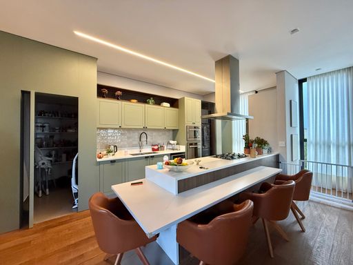 ▫️ Cozinha planejada equipada com fogão cooktop, micro-ondas e forno