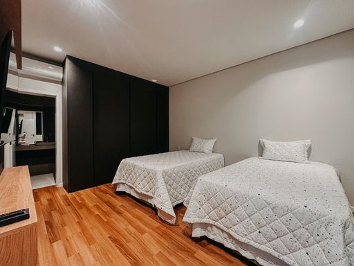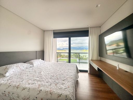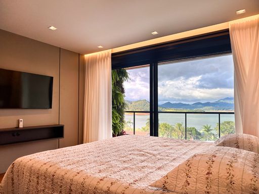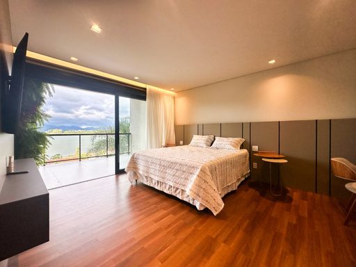 ▫️ 05 suítes amplas com armários e ar-condicionado, todas com vista para a represa e montanhas